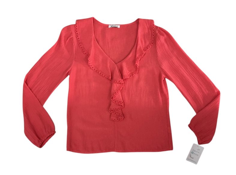 Añade un toque de frescura y romanticismo a tu armario con nuestra blusa en color coral. Esta prenda destaca por su tejido ligero con delicadas líneas verticales que aportan textura y un movimiento espectacular.