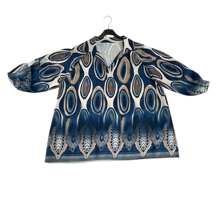 Descubre la comodidad y frescura de esta blusa. Su corte holgado es perfecto para los días calurosos, y su estampado étnico le da un aire bohemio y relajado. Ideal para tus escapadas de verano o para disfrutar de un día de relax.