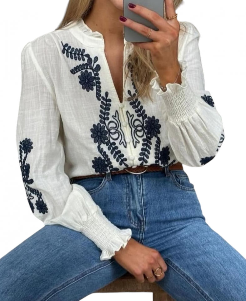 Dale un toque de encanto artesanal a tu armario con nuestra blusa blanca romántica. Confeccionada en un tejido ligero y texturizado (como lino o algodón de verano), esta prenda es ideal para los días cálidos. Su diseño destaca por los delicados e intrincados bordados florales en hilo azul marino que adornan el pecho y las mangas, aportando una sofisticación atemporal.