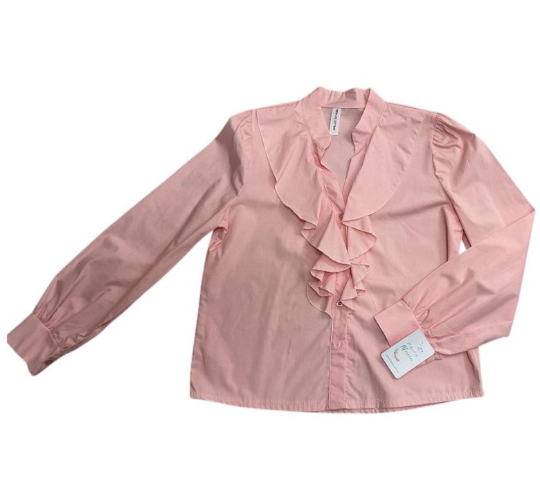El diseño destaca por su frontal con volantes (chorreras) que aporta volumen y movimiento, acompañado de un elegante cuello mao y botonadura central. Sus mangas largas cuentan con puños definidos y un ligero frunce en el hombro que realza la silueta de forma sofisticada.