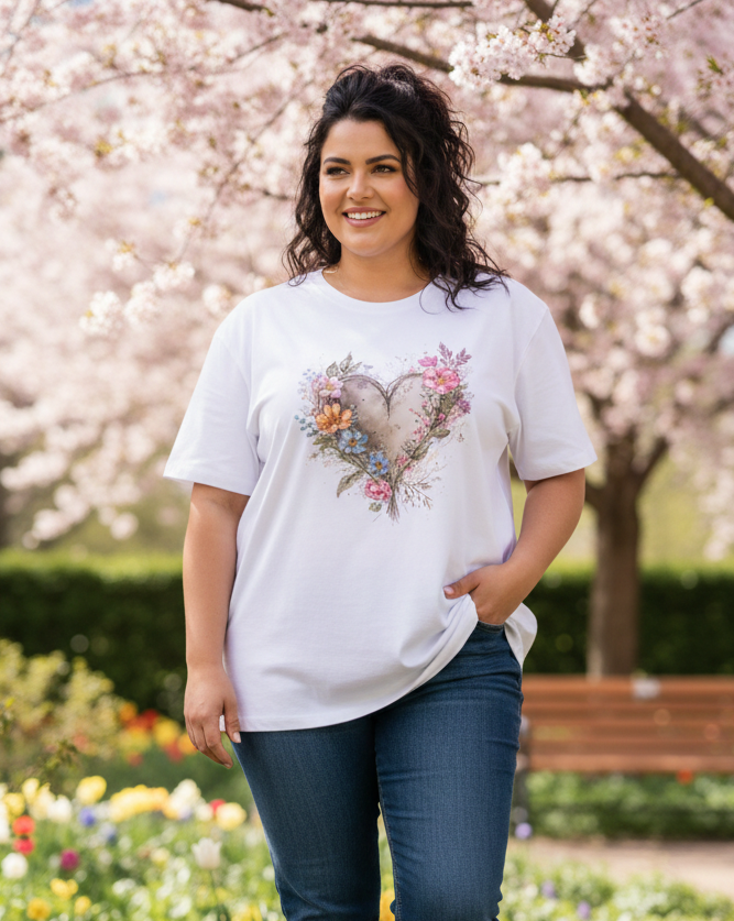 Nuestra camiseta con corazón floral no es solo una prenda básica, es una declaración de estilo. Diseñada pensando en la mujer moderna que busca comodidad sin renunciar a la elegancia, esta pieza presenta una ilustración artística en alta definición que captura la esencia de la naturaleza y la delicadeza de la acuarela.