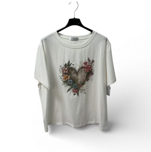 Camiseta mujer blanca algodón corazón flores acuarela