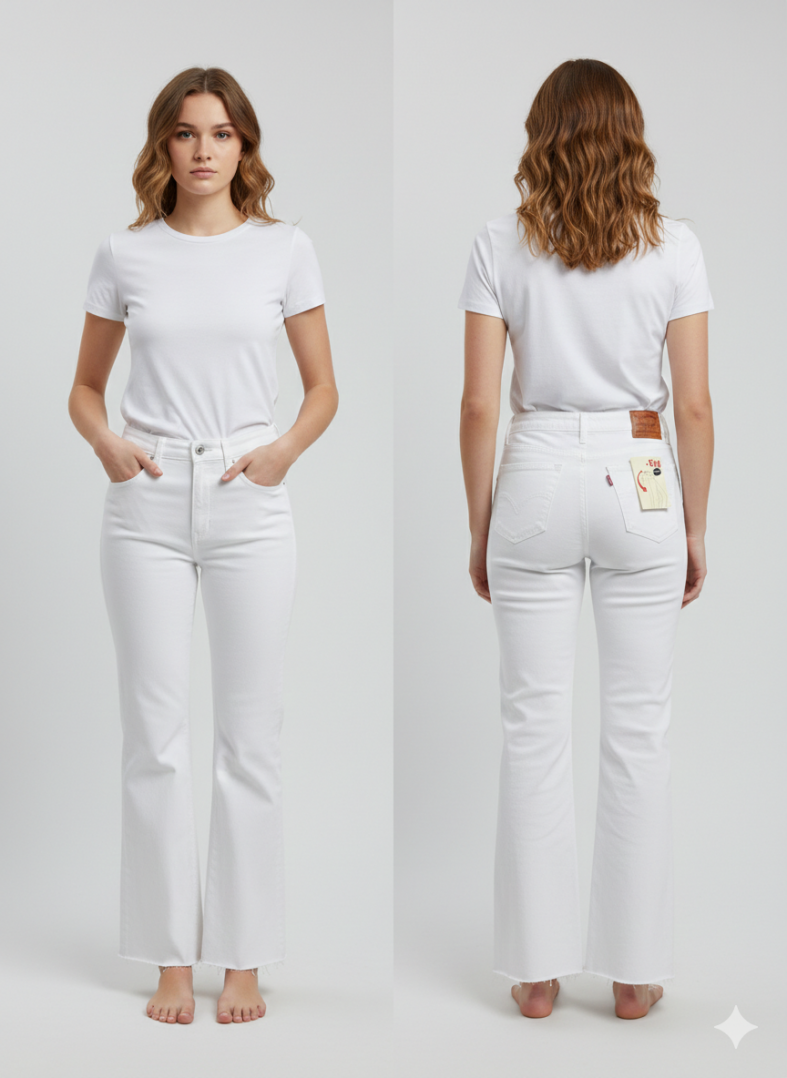 Añade un toque de frescura y estilo retro-moderno a tu colección con nuestros Jeans Flare en color blanco. Este pantalón no es solo un básico; es una pieza de diseño pensada para estilizar la figura gracias a su tiro alto y su corte ligeramente acampanado desde la rodilla.