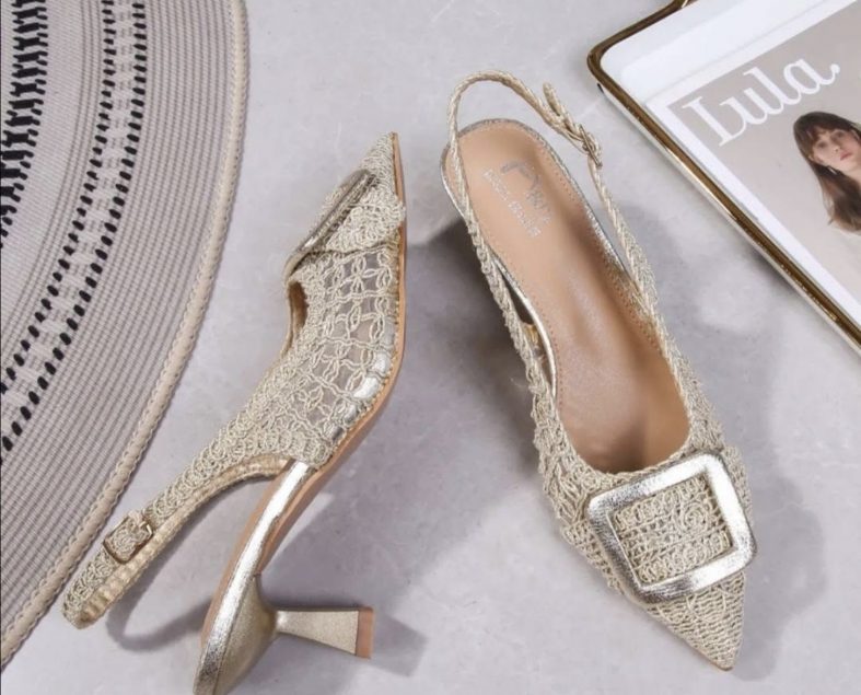 • Encaje de Ganchillo Intrincado: El cuerpo del zapato está meticulosamente confeccionado con un encaje de ganchillo en un tono dorado claro, creando una textura visualmente rica y transpirable. Este diseño aporta un aire bohemio pero refinado.